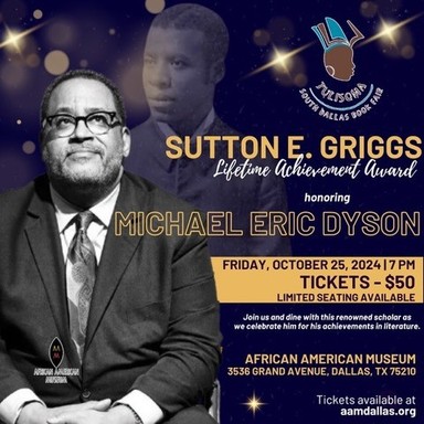 As part of the Tulisoma weekend, Dr. Dyson will be presented the Sutton E. Griggs Lifetime Achievement Award in Literature at dinner on Friday (Oct. 25) at 7 p.m. at the African American Museum. During the awards dinner, Dr. Dyson will discuss his writings and sign books. Tickets for the dinner are $50 and available at aamdallas.org/events.