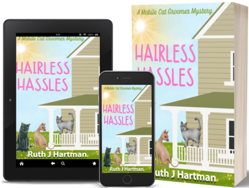 Hairless Hassles is the third book in author Ruth J. Hartman’s great Mobile Cat Groomer Mysteries, which features intrepid cat-mom Molly Stewart, and her feline family, Jasper and Percival. When elderly and very quirky clients, next-door neighbors Florence Makes and Lottie Campbell, become the main suspects in a murder, Molly can’t sit back and watch. She’s compelled to look deeper into the case and clear her friends’ names.